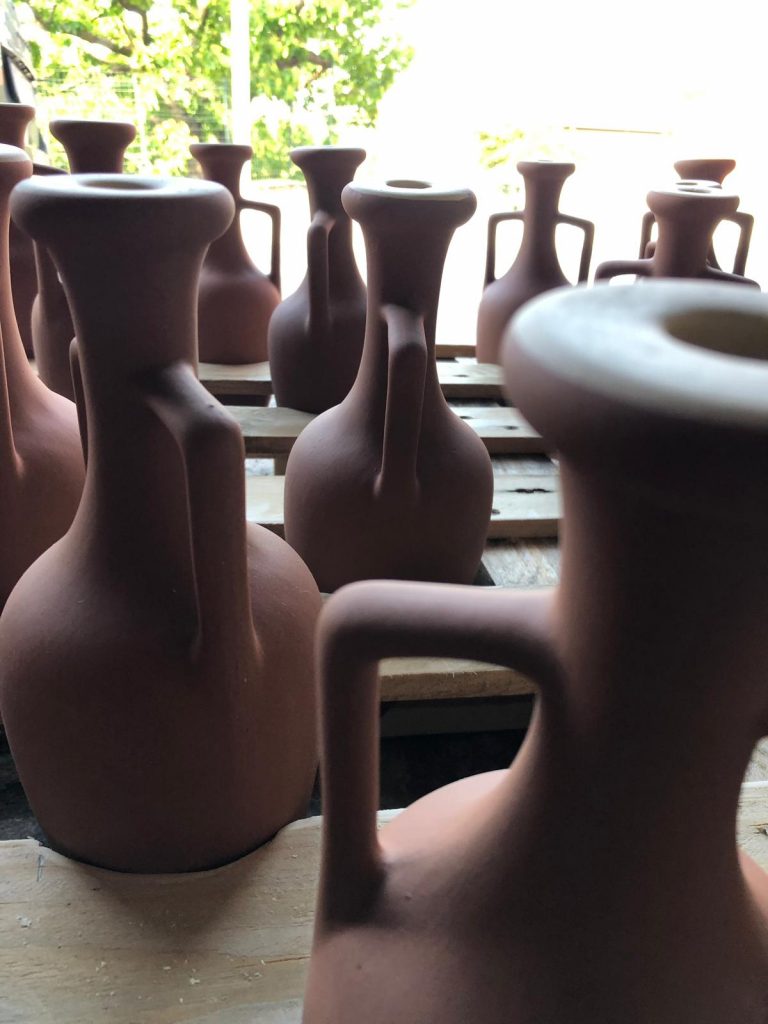 La fase successiva fu quella di realizzare una serie di prototipi, che con modifiche continue, ai manici,al collo,ecc…, tali da garantire all’anfora una forma per poter essere utilizzata anche a livello industriale.