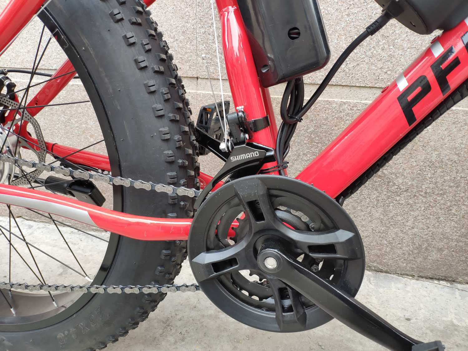 E-Bike rossa PFBpower, grazie ai suoi pneumatici può essere utilizzata su sabbia, neve e sterrati
